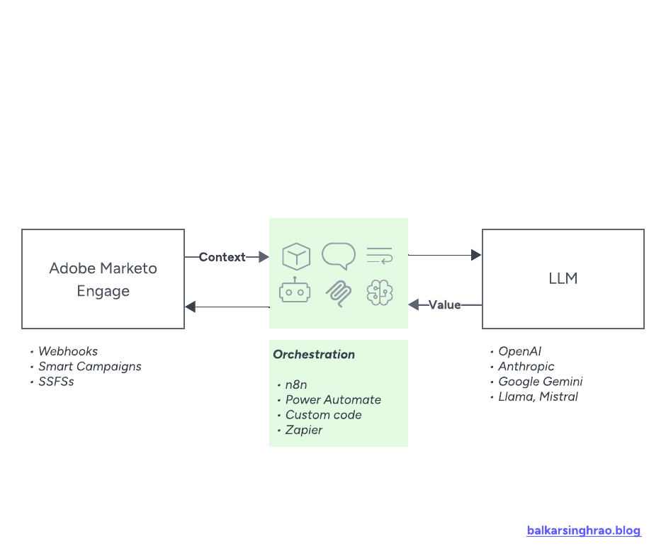 Here’s the overview of this Agentic AI integration with Adobe Marketo Engage – We move context from Marketo to LLM. We enable an Agentic AI integration to let Adobe Marketo Engage ask the LLM to use the context it gave it and create some value (clean some data in this case). The LLM replies with something valuable, in this case, clean data. We could say that configuring agents is ‘value engineering’.