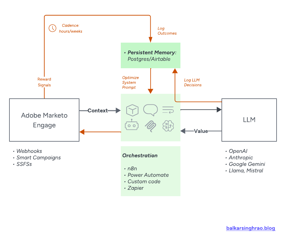 The pattern is the same: let Marketo do what it’s good at (deterministic workflows), and let AI agents handle what they’re good at (ambiguity, language, knowledge).
